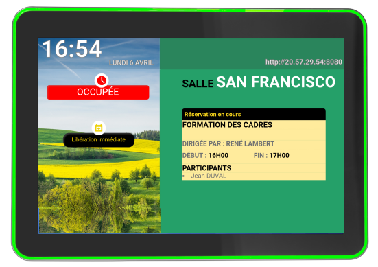 Une tablette qui affiche l'état de réservation de la salle, son nom et les informations sur la réunion en cours, autorisant la prise ou la libération de la salle en direct ou au travers de son back office accessible par le réseau de l'entreprise.
