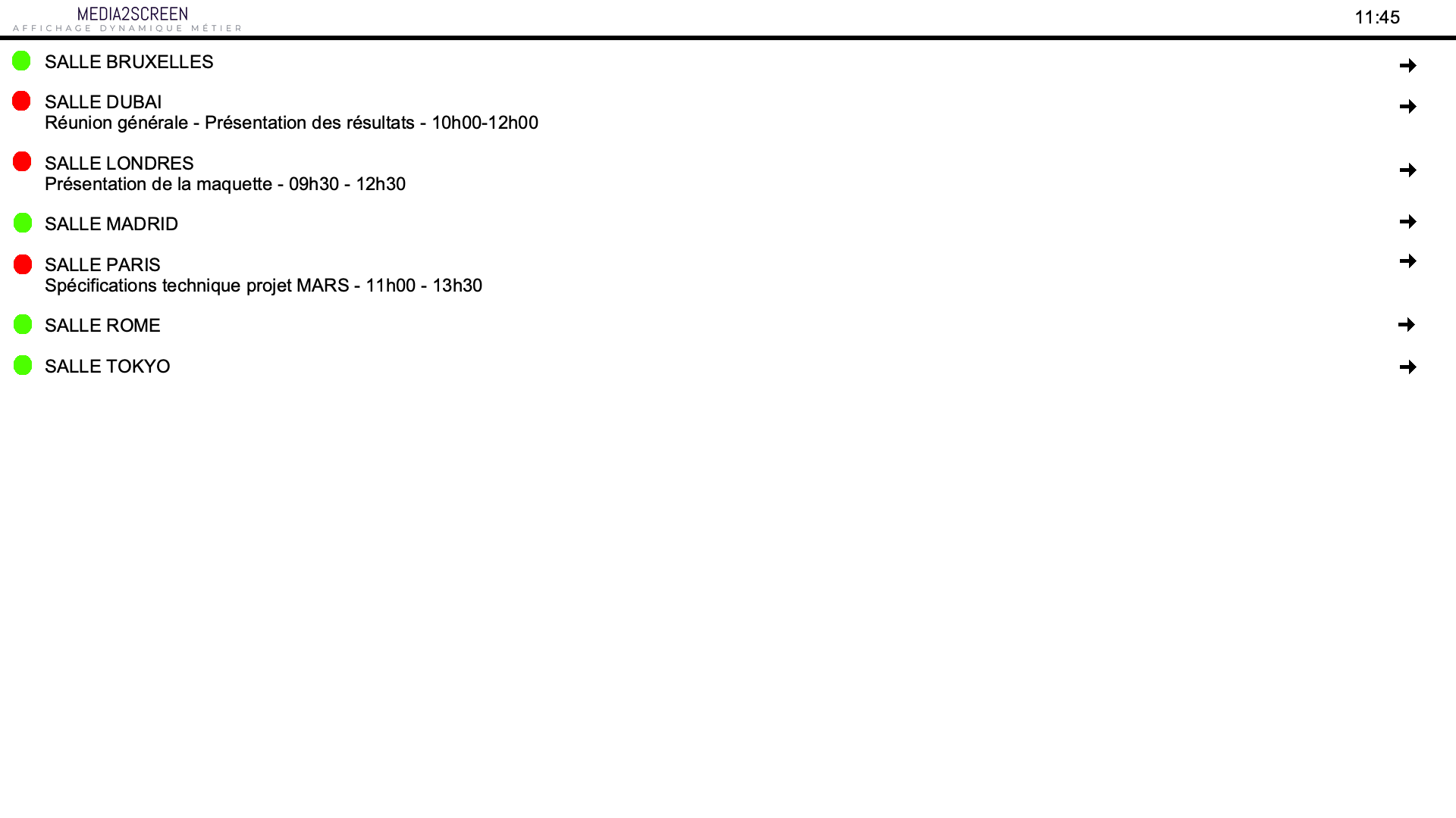 Un écran qui affiche la liste des salles de l'établissement, son état d'occupation, la réservation en cours et le fléchage pour s'y rendre...